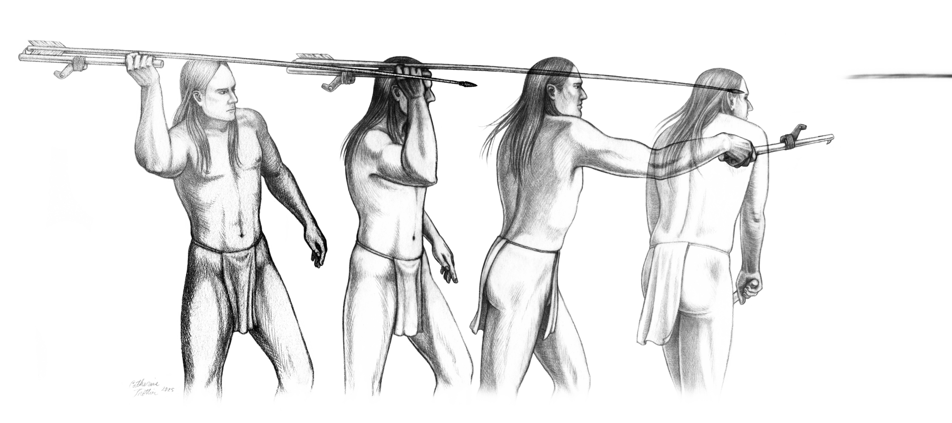 Reconstitution hypothétique de la pierre aviforme sur un propulseur de lance et mouvement du lancer du javelot.