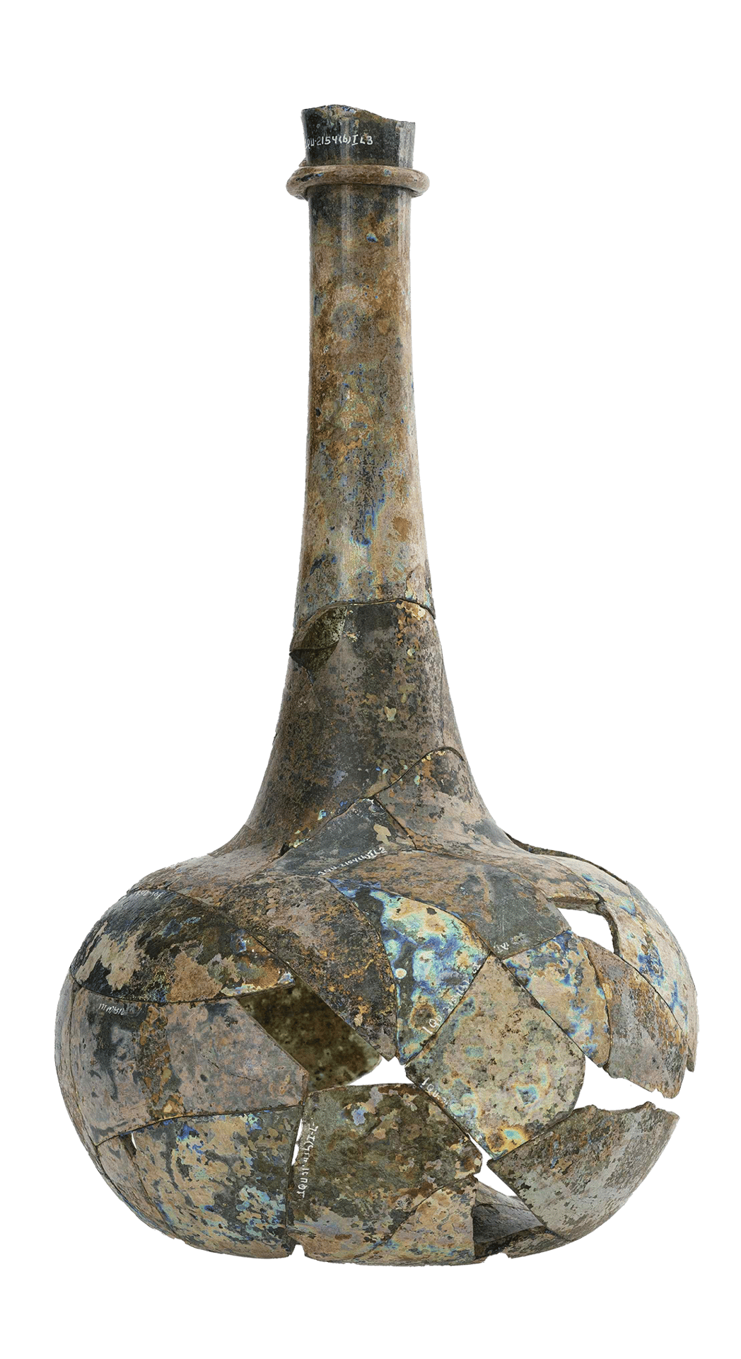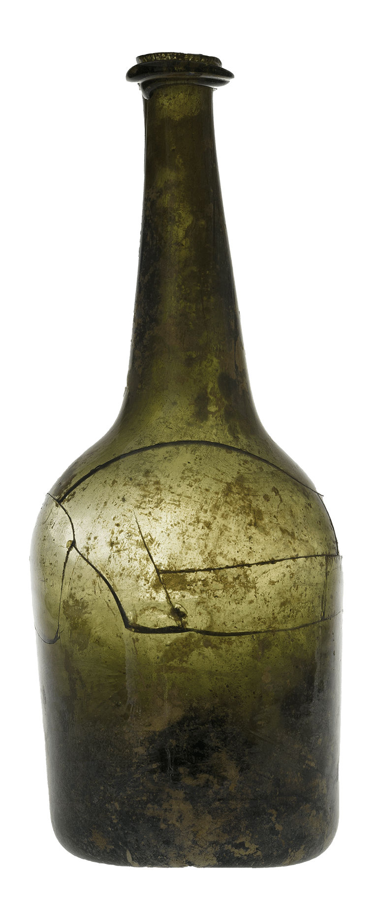 Bouteille à vin en verre, France, 1660-1730. Ce modèle de bouteille au long col, très ancien, était entreposé cul par-dessus tête de manière à conserver humide le bouchon.