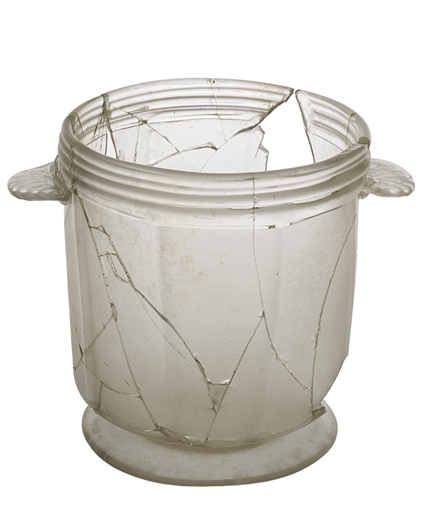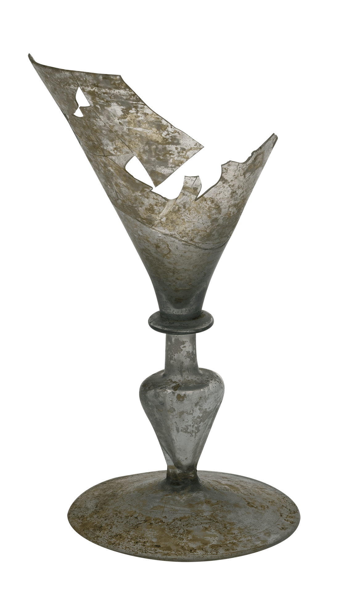 Verre à vin en verre incolore, France, 1725-1760. Les verres à vin du 18e siècle sont d’une minceur et d’une fragilité étonnantes. Ils étaient expédiés à Québec dans des caisses en bois garnies de paille.