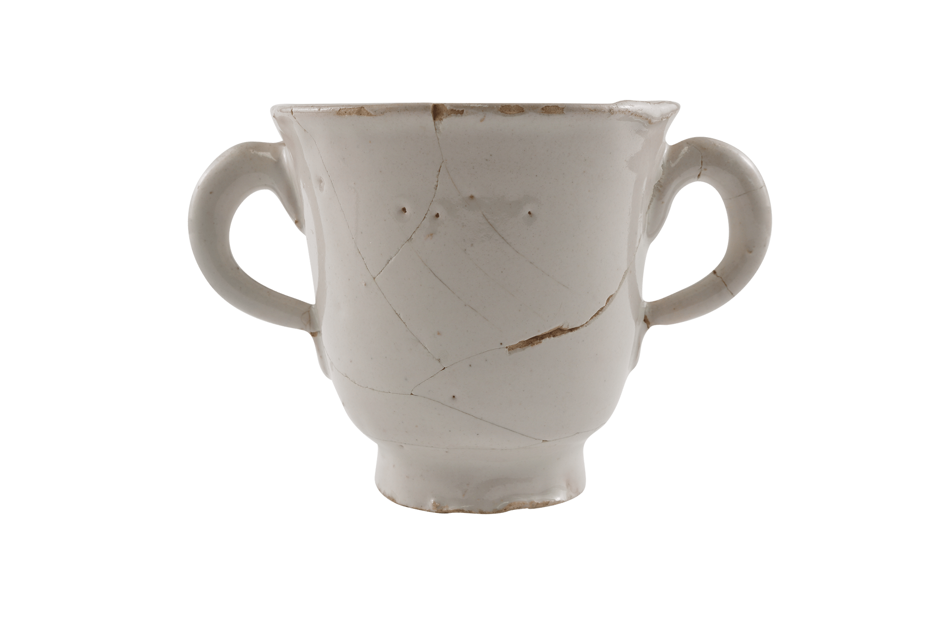 Tasse à chocolat chaud en faïence de Nevers, France, deuxième quart du 18e siècle. Le chocolat était consommé très chaud, d’où l’intérêt d’user d’une tasse à deux anses.