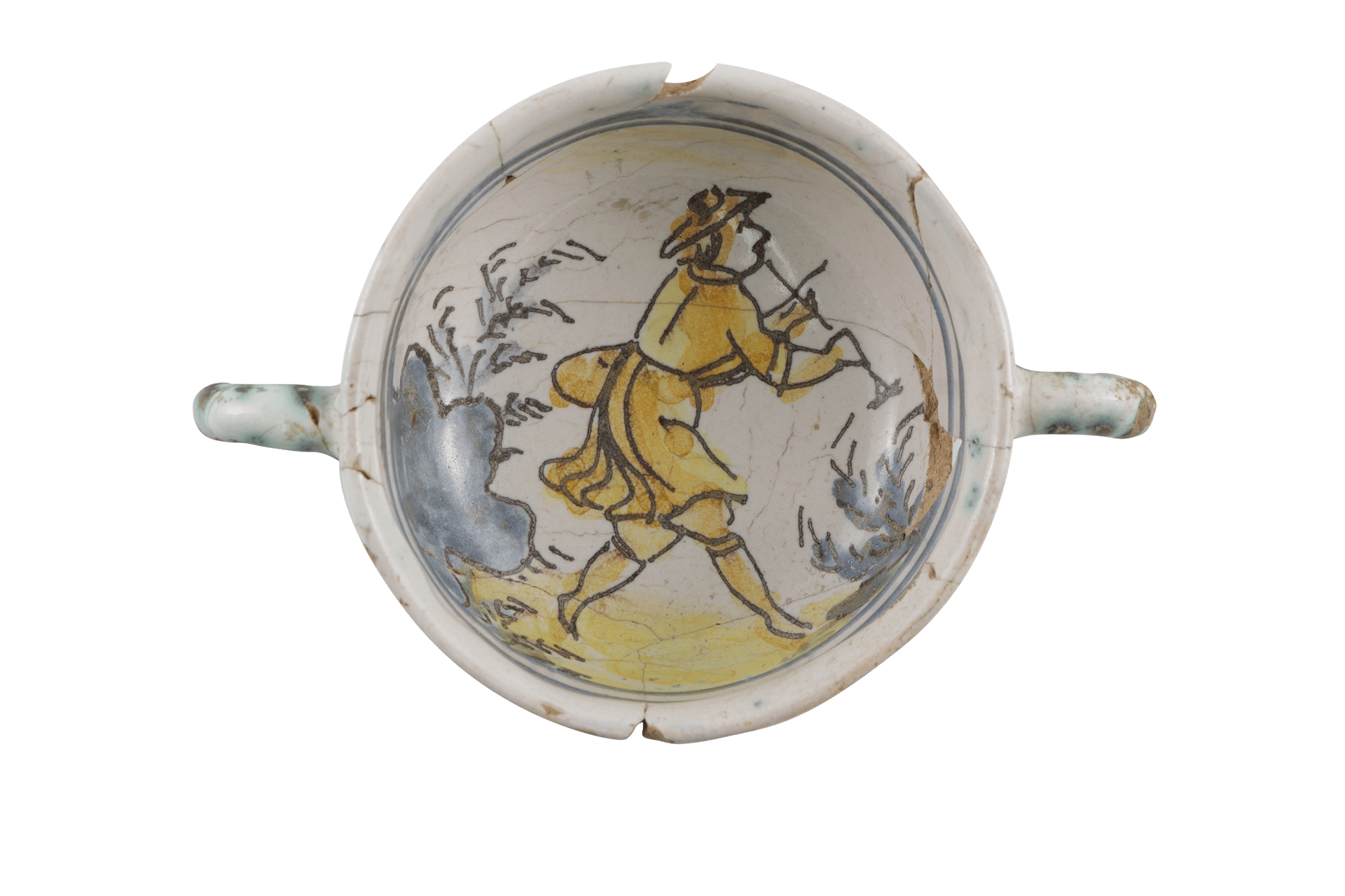 Taste-vin en faïence de Nevers, France, fin 17e siècle. Pour vérifier la qualité du vin servi à ses invités, l’hôte le goûte au moyen de cet article, encore en usage de nos jours.
