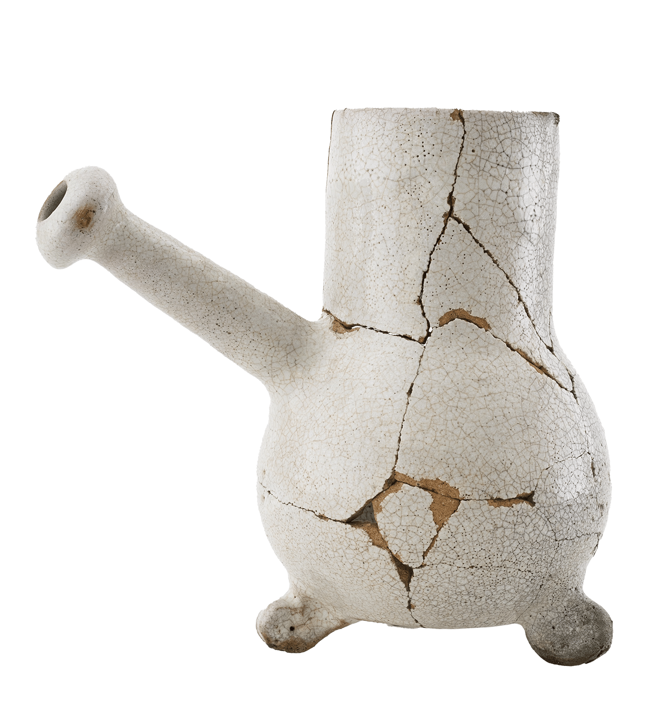 Cafetière ou chocolatière en faïence de Nevers, France, 1720 à 1750. L’objet était tenu au-dessus des braises pour en chauffer le contenu liquide, comme le montrent les traces de suie visibles sur ses pattes.