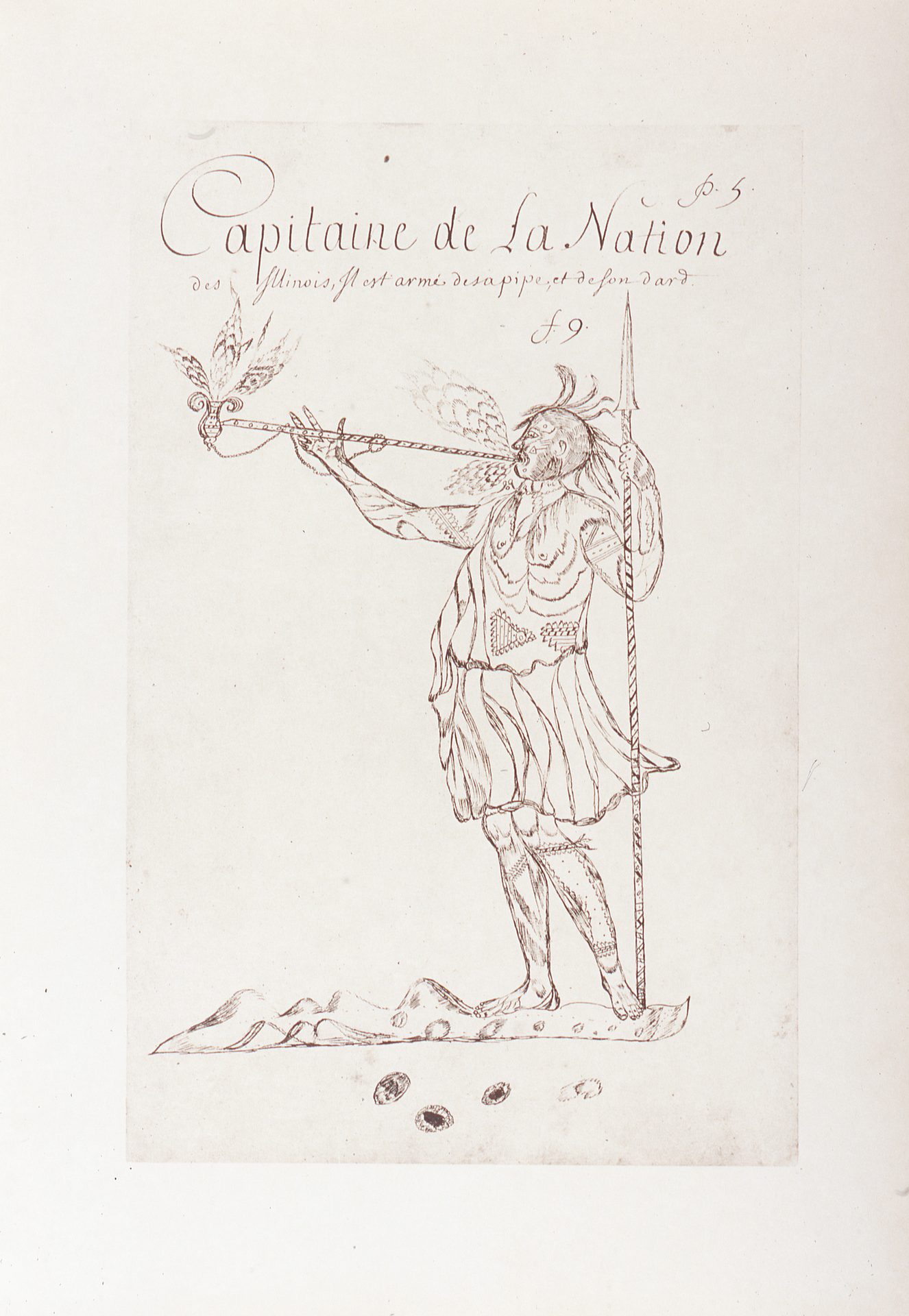 Ce chef autochtone arbore fièrement son long calumet cérémoniel. « Capitaine de la nation des Illinois, il est armé de sa pipe et de son dard ».