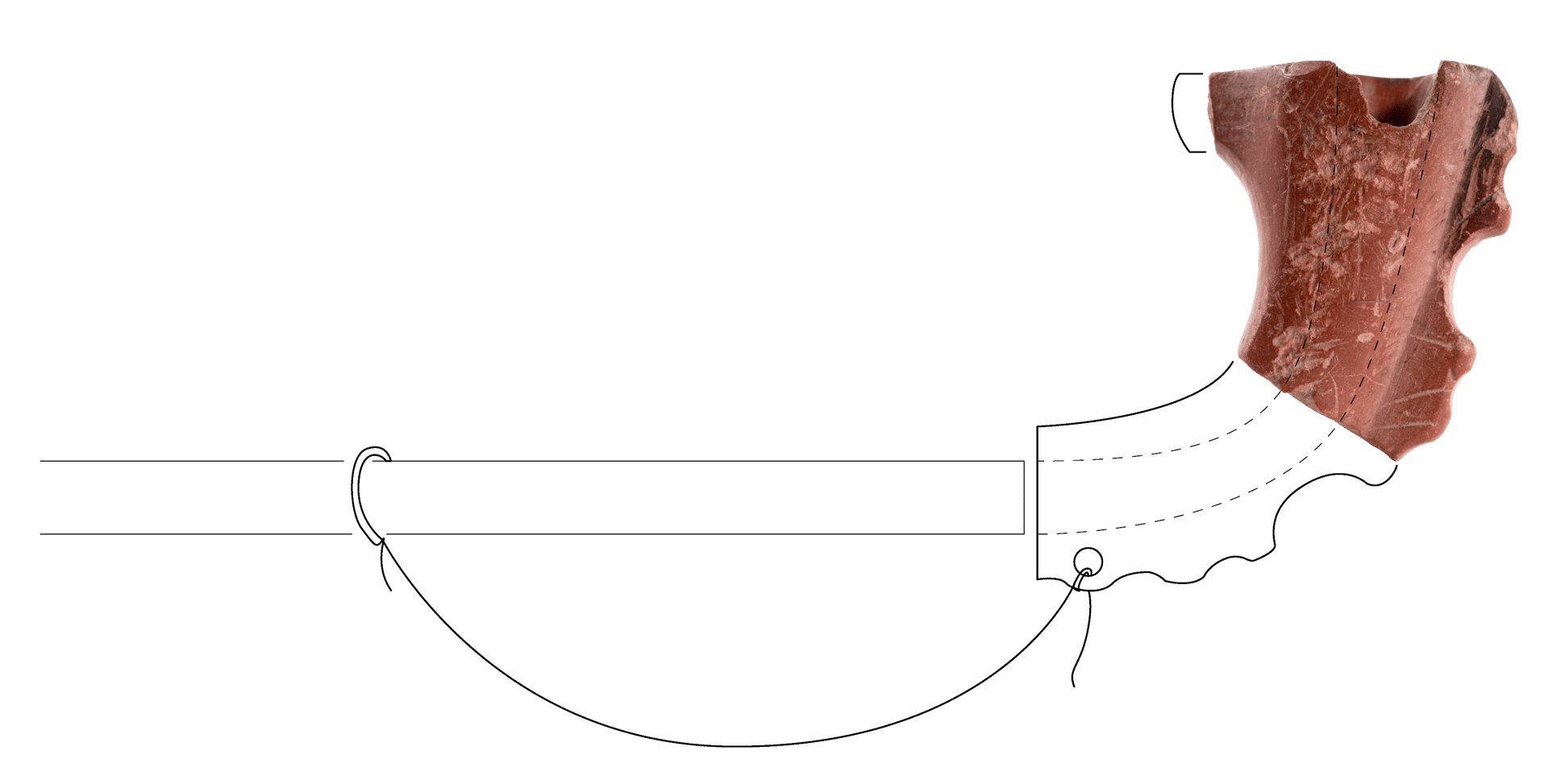 Pipe autochtone en argilite rouge trouvée sur le lieu de fondation de Montréal dans un contexte du début du 18e siècle.