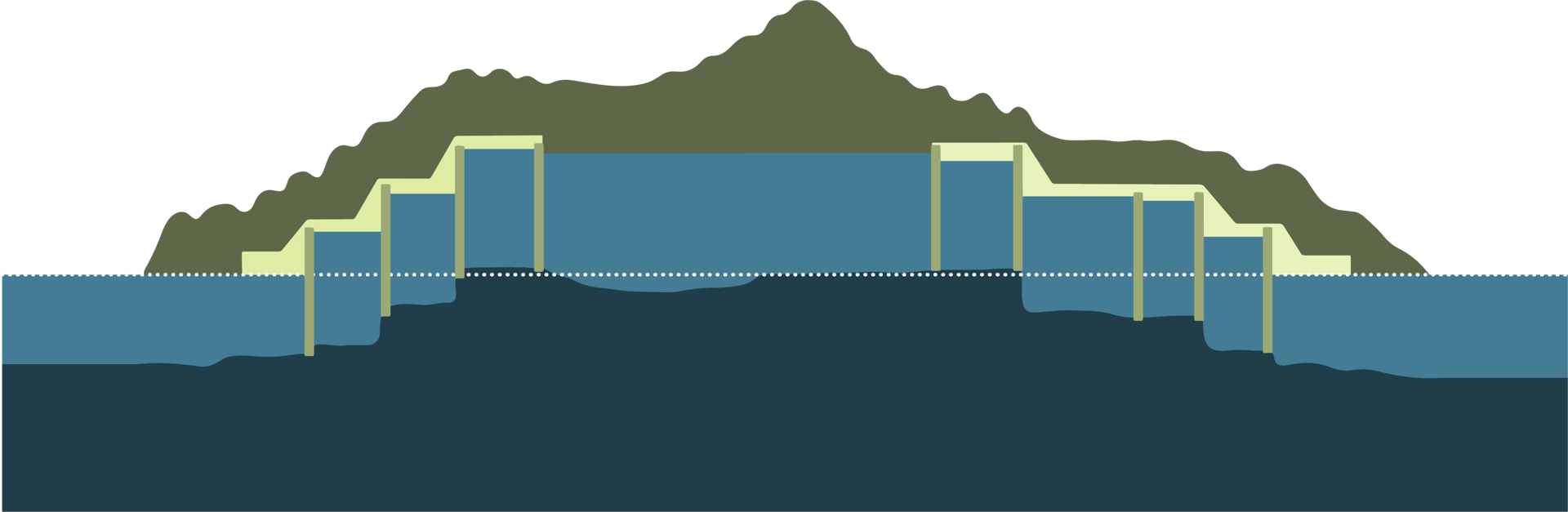Les bassins sont liés aux chambres où attendent les navires : ils y transfèrent ou aspirent de l’eau, pour modifier le niveau des chambres.