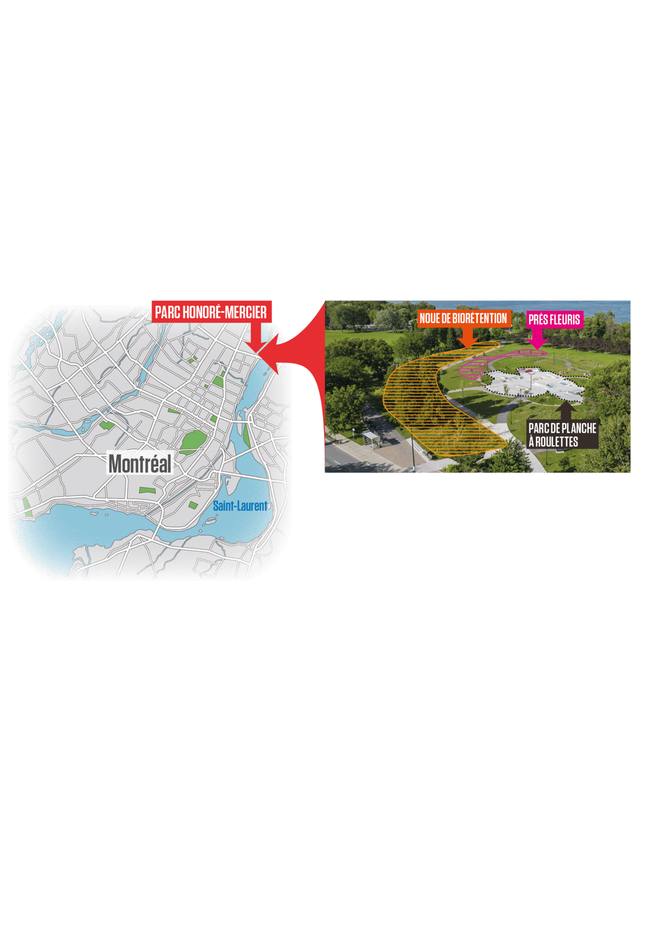 Face à ces épisodes, appelés à augmenter en raison des changements climatiques, Montréal teste une solution innovante : les noues de biorétention, soit des rigoles de végétation spécialement conçues pour capter et évaporer l’eau. Dans le parc Honoré-Mercier de l’arrondissement Hochelaga-Maisonneuve, une noue de biorétention s’étale depuis un an sur 1550 m2, ce qui en fait la plus grande en ville. Elle capte l’eau qui se déverse dans le parc de planche à roulettes juste à côté.