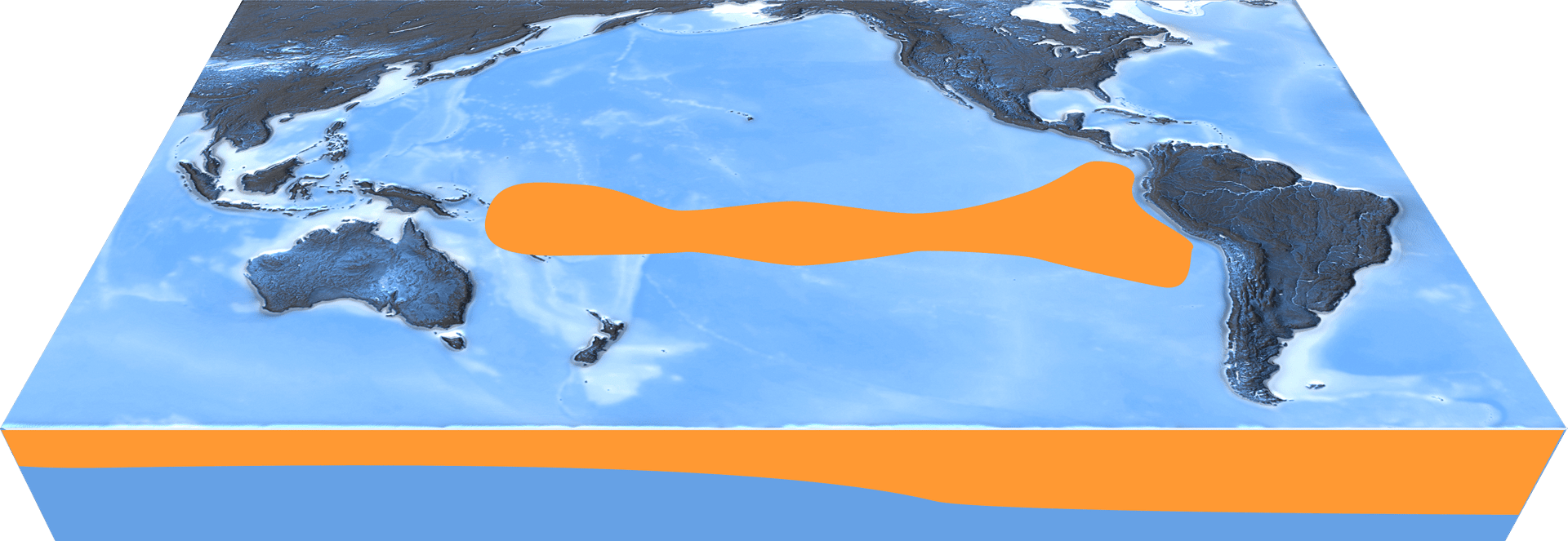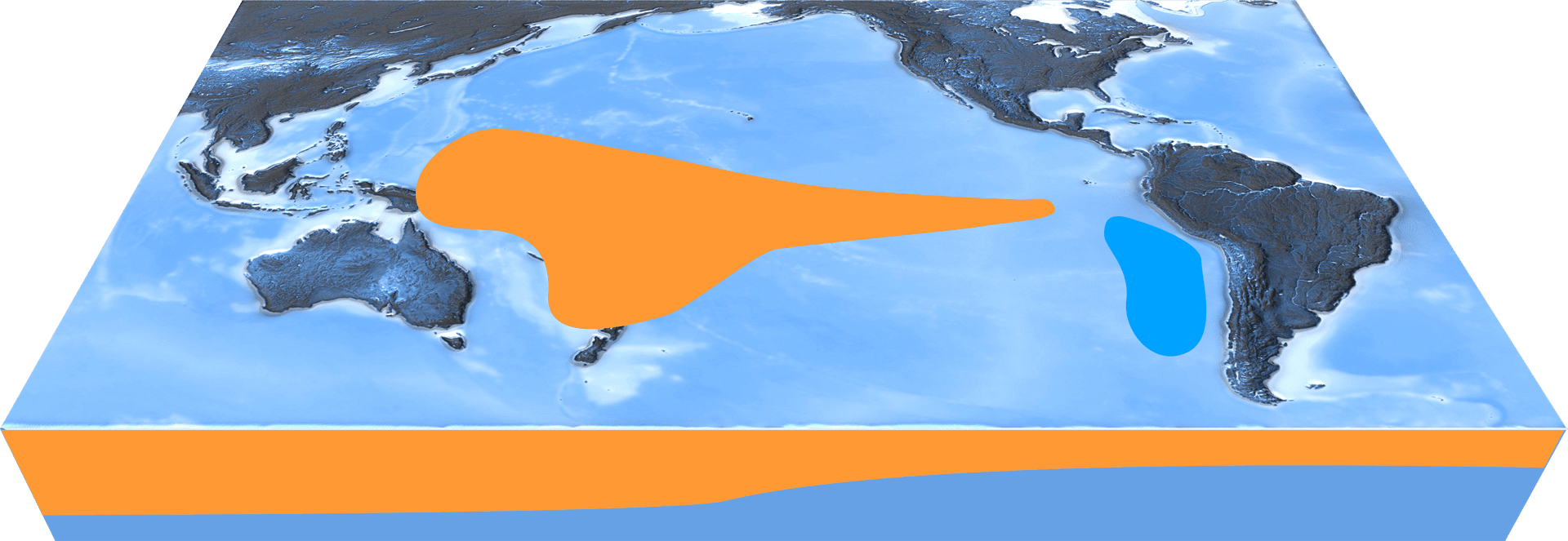 L’eau chaude est poussée vers l’ouest et l’eau froide remonte des fonds marins à l’est.