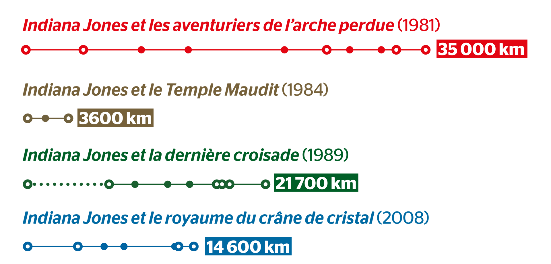 C’est une des caractéristiques de cette saga de films d’aventure aux 7 Oscars, dont le dernier volet, Indiana Jones et le Cadran de la destinée, est projeté au cinéma dès ce jeudi. Les quatre premiers films ont vu Indy parcourir le monde à la recherche d’artefacts mystiques, visitant des pays comme le Népal, l'Égypte, l'Inde, l'Italie ou l'Allemagne. Quant aux lieux visités lors du cinquième… pas de divulgâcheur ici.