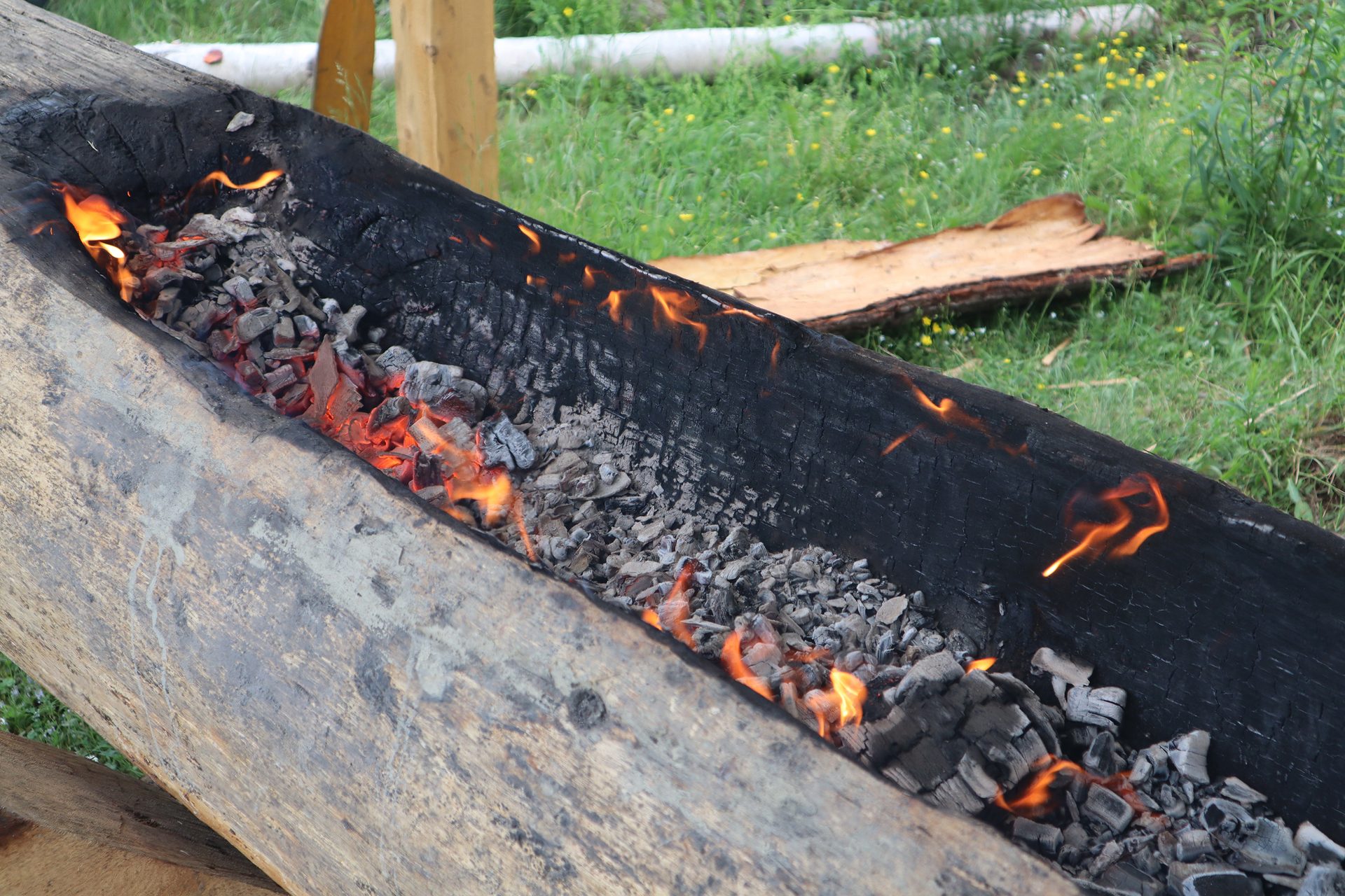 Abattage du pin blanc à l’aide d’une reproduction de hache en pierre et évidage du tronc par brûlis.