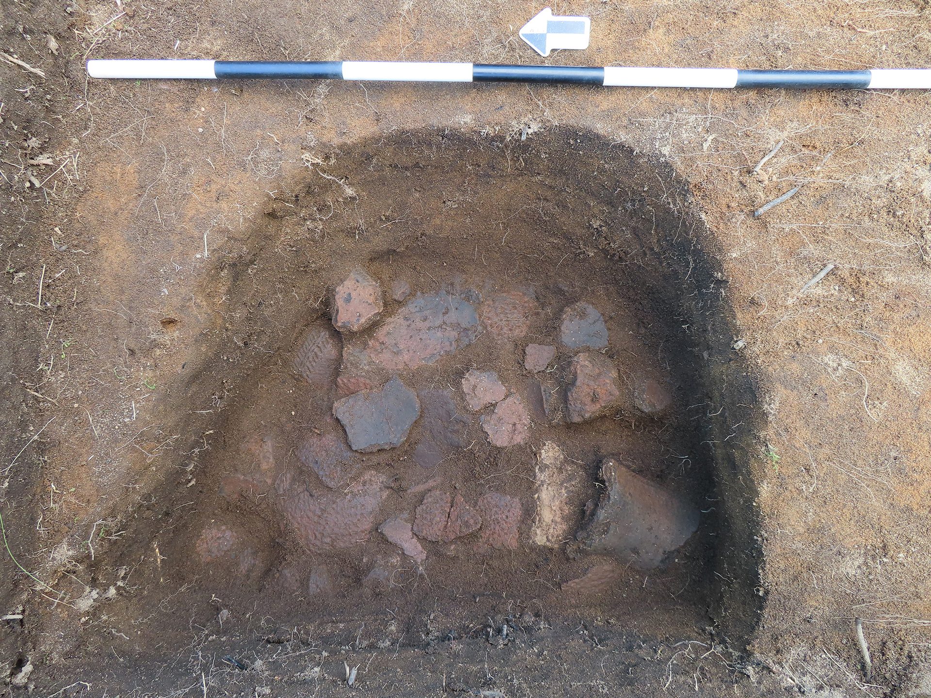 Une fosse contenant les fragments de deux vases en céramique, site Isings.